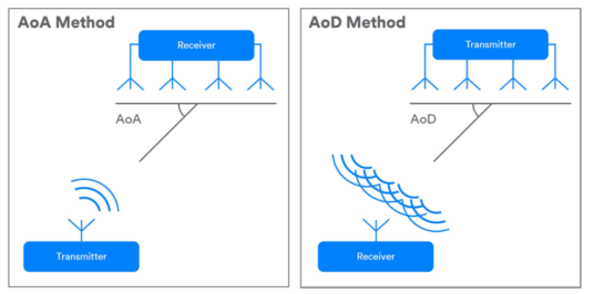 最新藍(lán)牙標(biāo)準(zhǔn)(5.1)允許系統(tǒng)使用天線陣列來(lái)確定通信方向(圖3)。使用天線陣列的單個(gè)設(shè)備可以與任何其他藍(lán)牙設(shè)備一起確定彼此的相對(duì)方向。這是通過(guò)測(cè)量到達(dá)角(AoA)或離開(kāi)角(AoD),這取決于通信的方向和哪個(gè)設(shè)備有天線陣列。